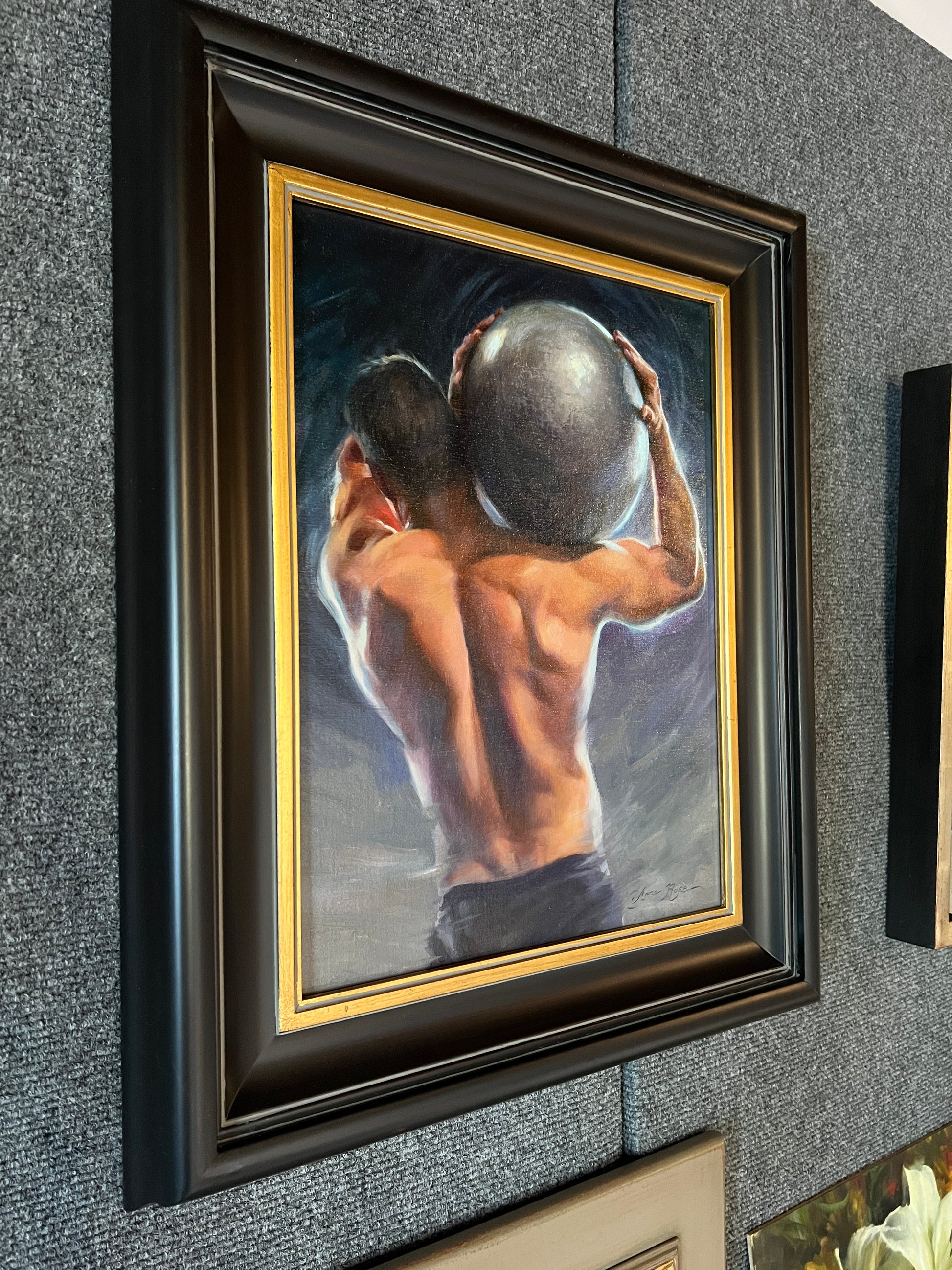 16 x 12 inches, oil on linen panel. Framed in black with gold liner.