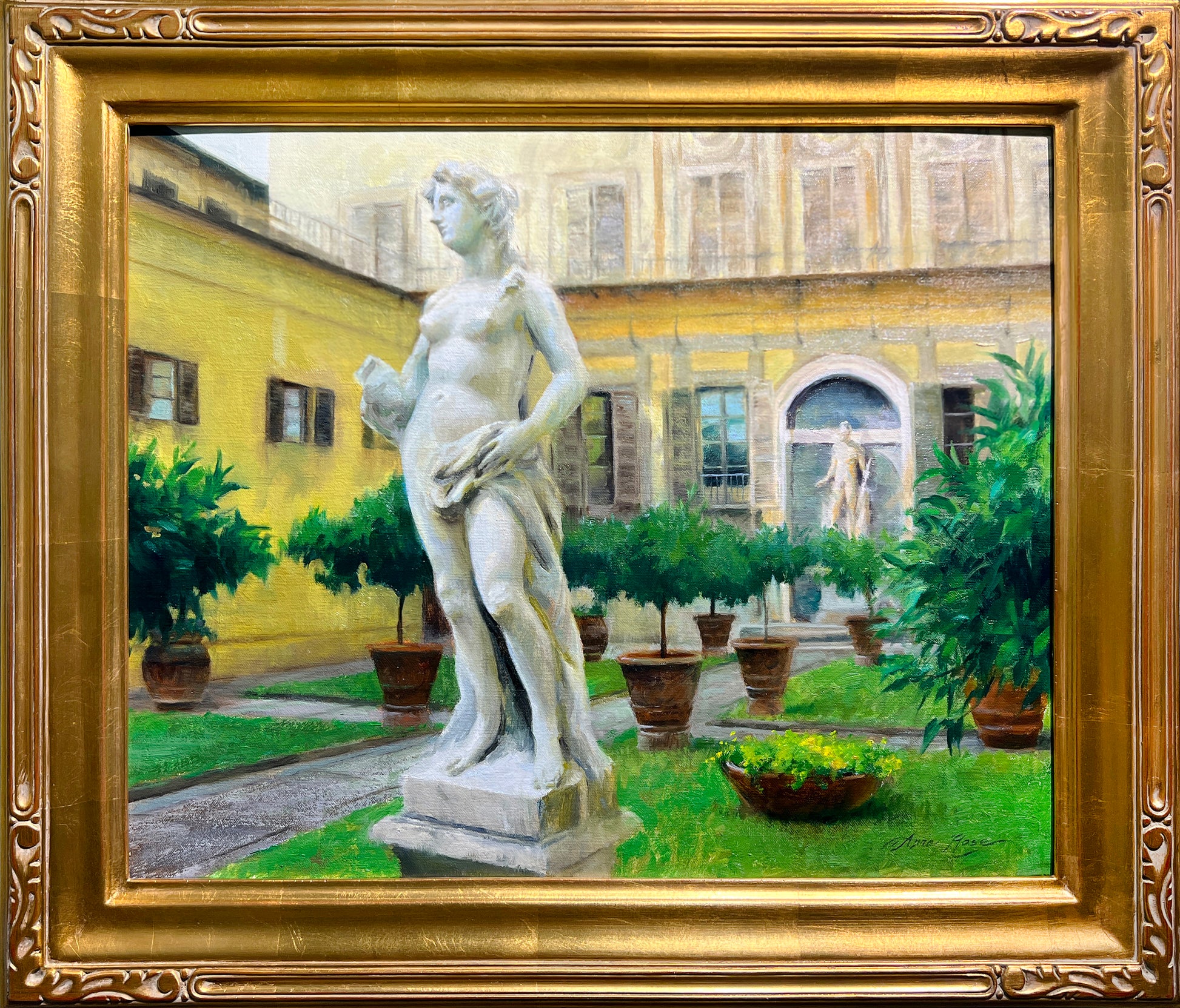 16 x 20 inches, oil on linen panel. Depicting the sculpture garden at the Palazzo Medici Riccardi in Florence, Italy. (Framed in a gold frame)