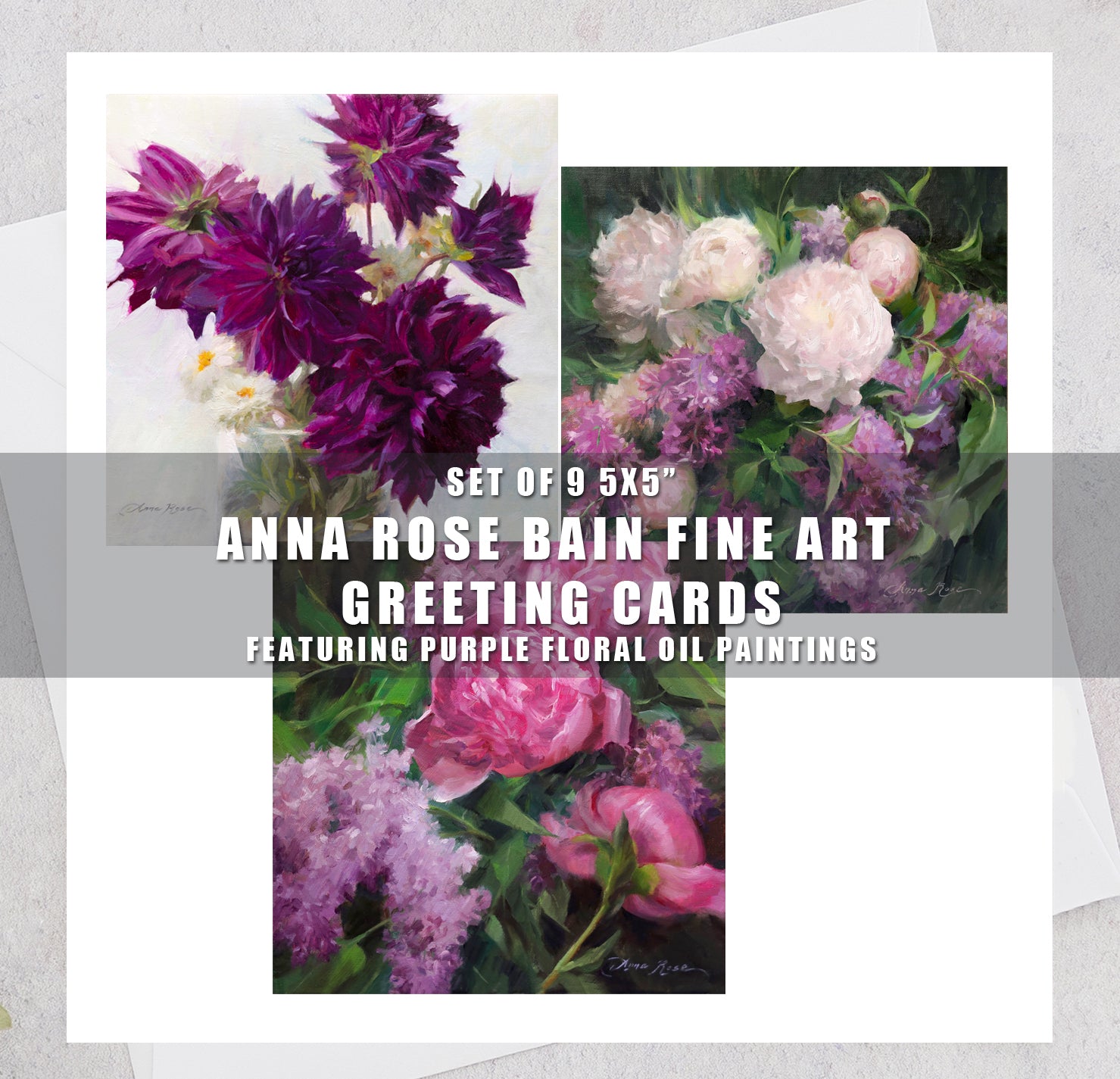 Set of 9 5x5" greeting cards featuring three different purple florals by Anna Rose Bain. With the right image, a greeting card can be a gift all on its own! These cards measure approximately 5" x 5" horizontal, and look striking when framed on your wall or shelf. They are blank on the inside and come with matching white envelopes. The title of the painting is printed on the back of each card.