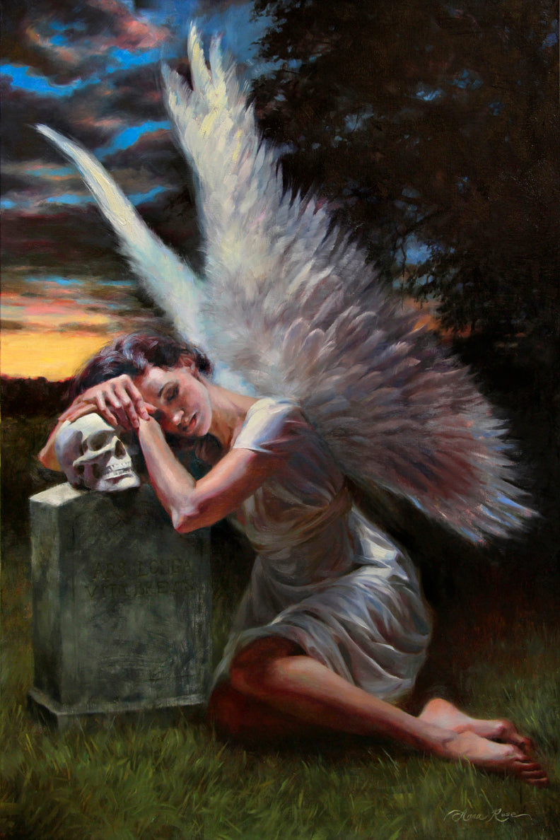 The grave stone faintly reads, "Ars Longa, Vita Brevis," in Latin which means "Life is short but art is forever."