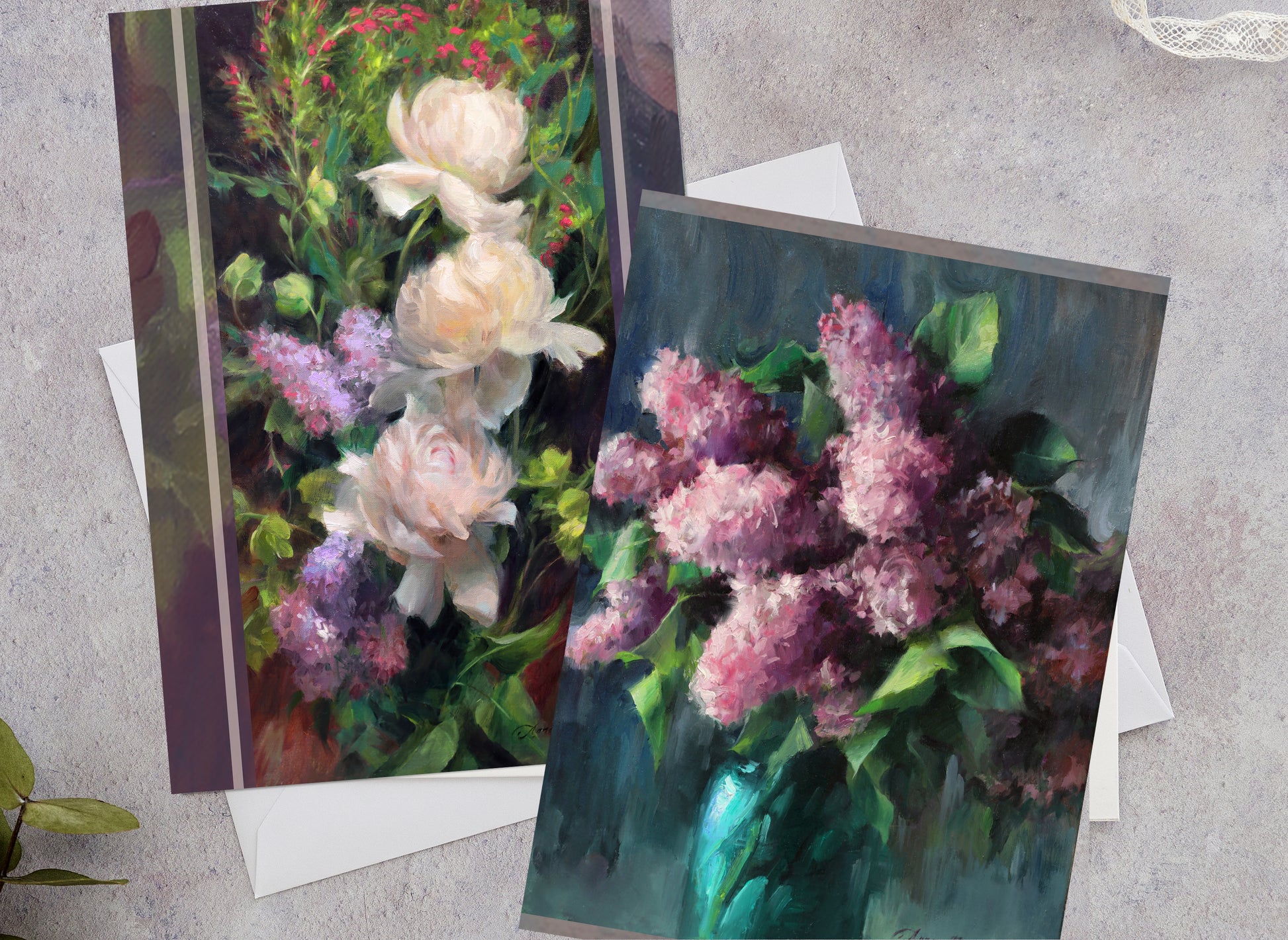 Each set of 8 includes (4) cards of each painting. Cards are of original oil paintings by Anna Rose Bain. With the right image, a greeting card can be a gift all on its own! These cards measure approximately 7" x 5" vertical, and look striking when framed on your wall or shelf. They are blank on the inside and come with matching white envelopes. The title of the painting is printed on the back of each card. Paintings shown here are: "Lilacs and Peonies," and "Last of the Lilacs."